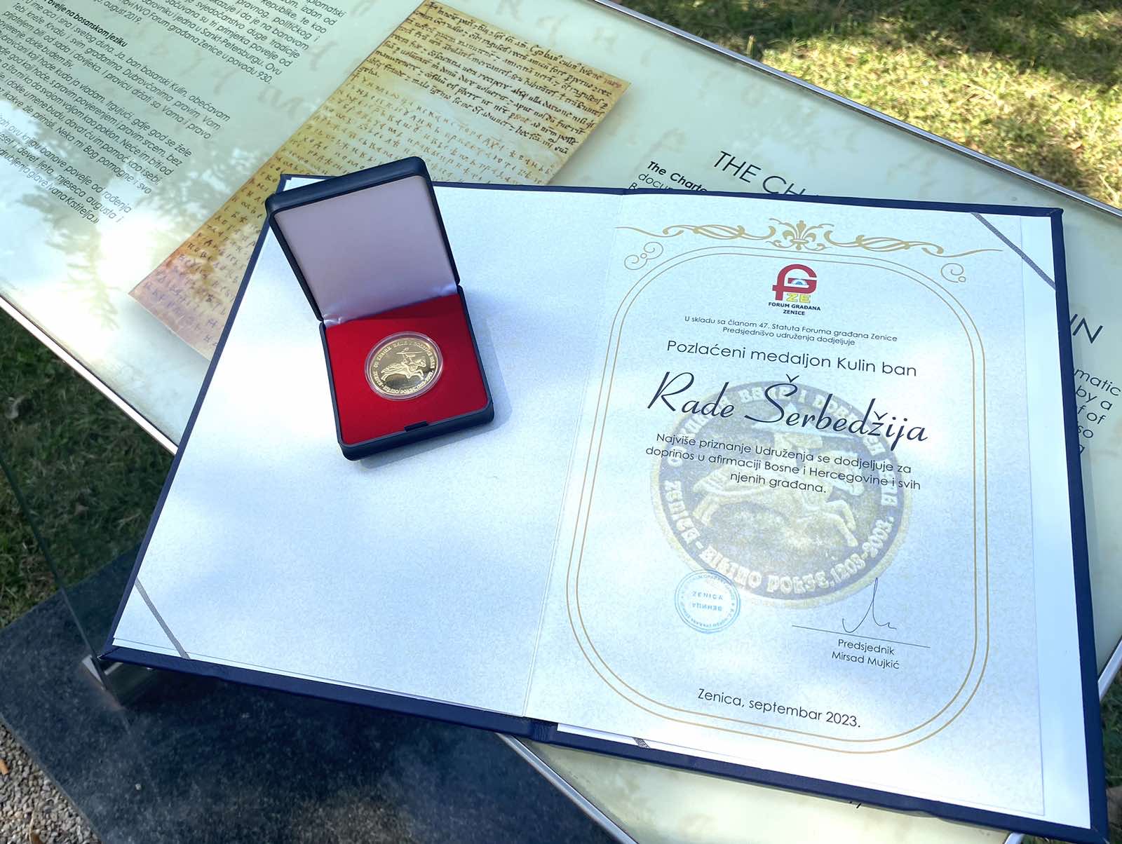 Istaknuti glumac i građanin svijeta Rade Šerbedžija dobitnik je priznanja “Pozlaćeni madaljon Kulin ban” za doprinos u afirmaciji Bosne i Hercegovine i svih njenih građana.