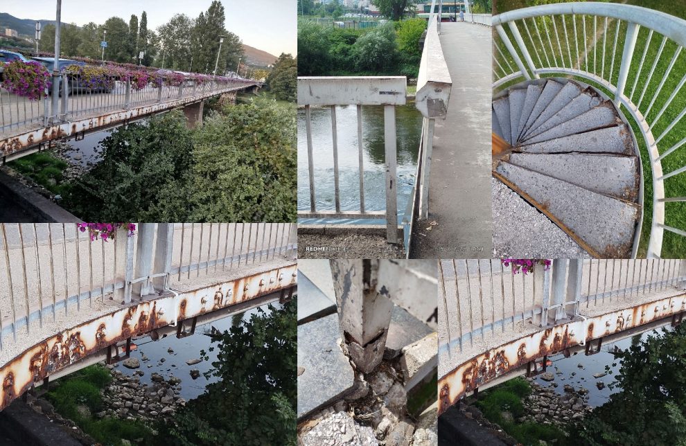 Kako ističe Alibegović, pogled na vanjski dio mosta kod Lamele otkriva korodiranu čeličnu konstrukciju i ruševno stepenište.