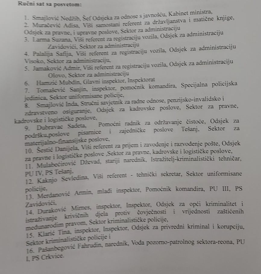 Pored službenika MUP-a ZDK, ministar i komesar su uručili priznanja predstavnicima Državne agencije za istrage i zaštitu, Obavještajno-sigurosne agencije Bosne i Hercegovine, Federalnog ministarstva unutrašnjih poslova, Kantonalnog tužilaštva ZDK, JU Dom Penzionera Zenica, Srednje muzičke škole Zenica, Univerziteta u Zenici.