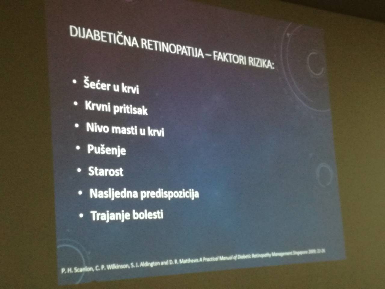 Očne komplikacije su u velikom napredovanju i one zahtjevaju noviji, moderniji način djelovanja kao što to ima JU Očna poliklinika u Doboj Jugu sa savremeni aparaturom, koju vodi dr. Čabrić. Isto tako, zatraženo je od ZZO ZDK da se pacijenti od dijabetesa mogu upućivati na ovu kliniku, jer vremenski rokovi u KB Zenica za preglede su jako dugi, te pacijentima treba omogućiti savremeni pristup liječenja u oblasti oftalmologije, pravo na drugo mišljenje. Ovom predavanju bilo je prisutan veliki broj pacijenata,ljekara, medicinskih radnika, kao i predstavnika Instituta za zdravlje i sigurnost hrane.