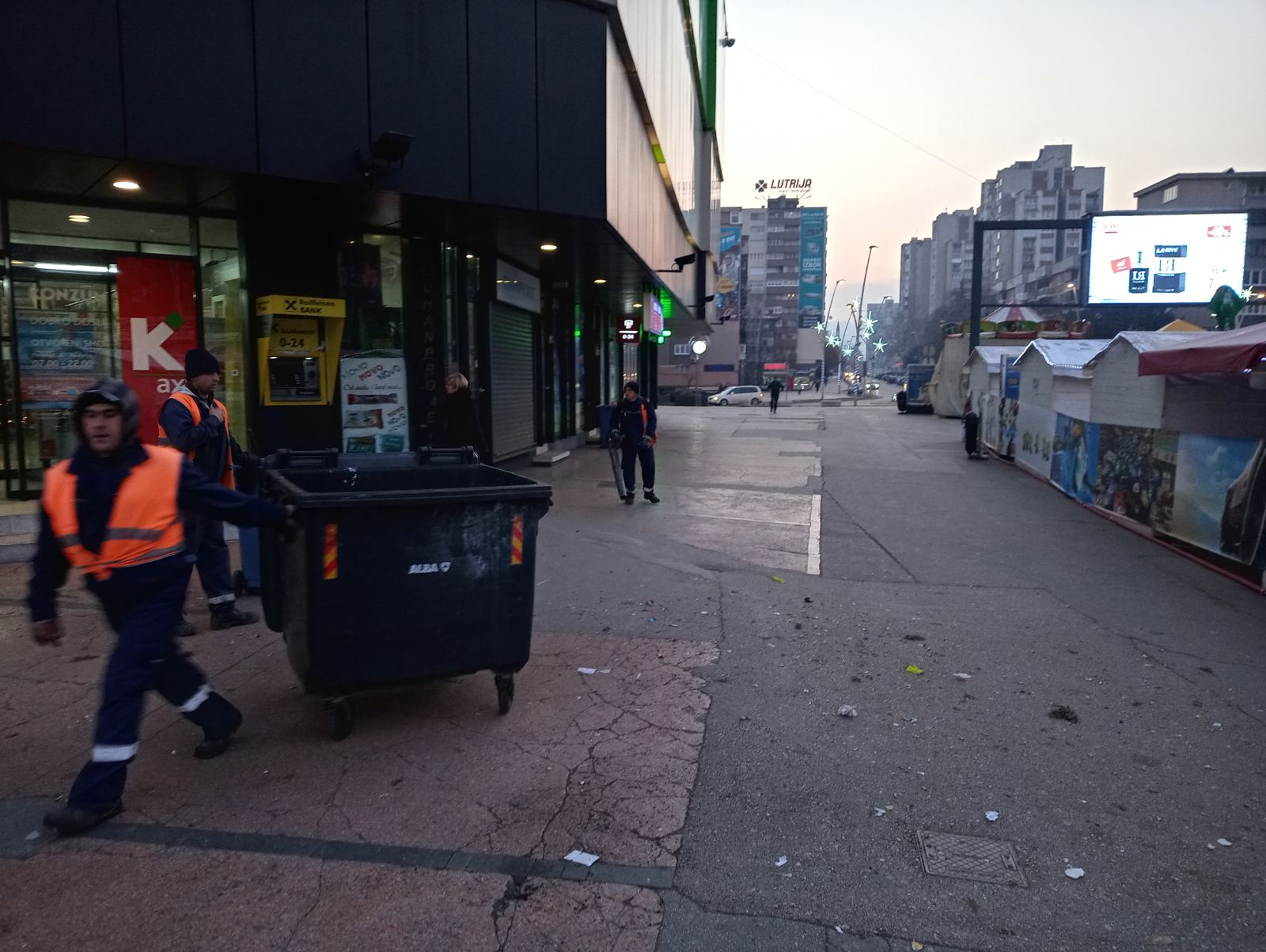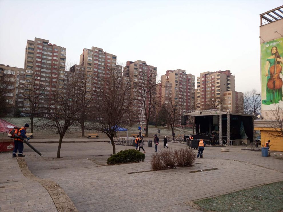 Nakon sinoćnjeg koncerta na Trgu Alije Izetbegovića, za danas i večeras se sprema novi novogodišnji program. Da bi Trg dočekao hiljade onih koji žele dočekati Novu na otvorenom, treba ga “upristojiti”, pa su radnici ALBA-e jutros rano, dok su mnogi spavali, “pospremili” ostatke otpada od sinoćnjih gostiju. Naš čitalac ja zabilježio par kadrova radova na minus šest.