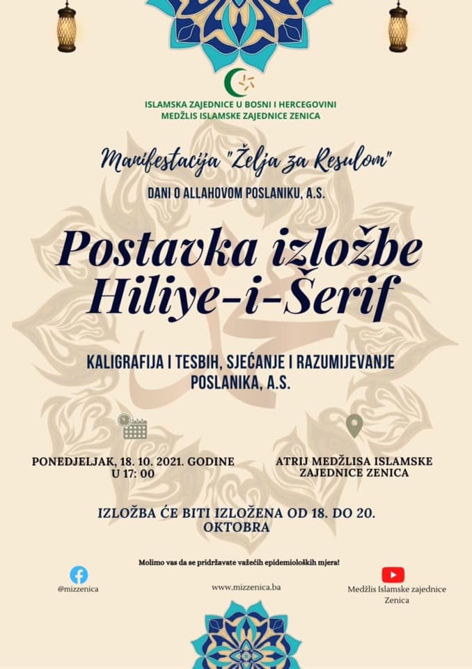 FOTO: U atriju MIZ Zenica otvorena trodnevna izložba “Hilye i Šerif”- Jučer, 18.10.2021.godine, u atriju Sultan Ahmedove medrese otvorena je trodnevna izložba “Hilye i Šerif” – kaligrafija, sjećanje i razumjevanje Poslanika a.s.