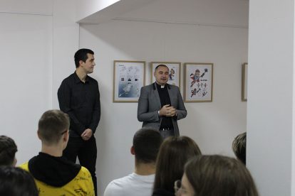 Autor Cvjetković je govorio o karakter dizajnu i stripu, a na poseban način je objasnio što je želio postići ilustracijom škole. „Gledajući ovu školu na fotografijama iz zraka mi se učinilo kao da su krovovi poput otvorene knjige, ne znam je li to bila zamisao arhitekte ili je slučajno izašlo tako, ali mi se učinilo zanimljivim taj moment uvrstiti u ovu ilustraciju škole kao odgojno-obrazovne ustanove“, istaknuo je mladi umjetnik u svom obraćanju.