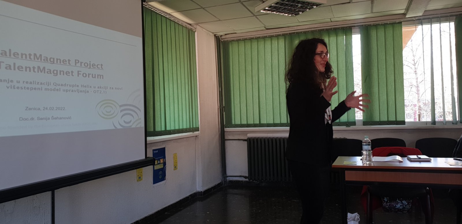 U okviru realizacije aktivnosti iz radnog paketa T2 (TalentMagnet Toolkit) projekta TalentMagnet, u prostorijama Studentskog centra Univerziteta u Zenici, u četvrtak, 24.02.2022. godine, održan je TalentMagnet forum u okviru kojeg se razgovaralo o modelu Qudruple helix kao modelu inovativnog i održivog društvenog razvoja, akterima modela i načinu na koji mogu dati svoj doprinos rješavanju iznimno aktuelne problematike privlačenja i zadržavanja mladih talenata u našoj sredini. Projekat TalentMagnet odobren je pod nazivom „Improved Institutional Capacities and New Multilevel Governance for Talent Attraction and Retention in the Danube Region“ – „TalentMagnet“ (“Poboljšani institucionalni kapaciteti i novo upravljanje na višem nivou za privlačenje i zadržavanje talenata u Dunavskom području”) u sklopu Trećeg poziva za projektne prijedloge Interreg Dunavskog transnacionalnog programa 2014-2020 (DTP). Projekat je finansiran od strane EU fondova (ERDF, IPA, ENI). Jedan od projektnih partnera iz 12 zemalja je i Stručna služba za razvoj i međunarodne projekte Zeničko-dobojskog kantona koja je i organizator svih aktivnosti projekta TalentMagnet na našem području.
