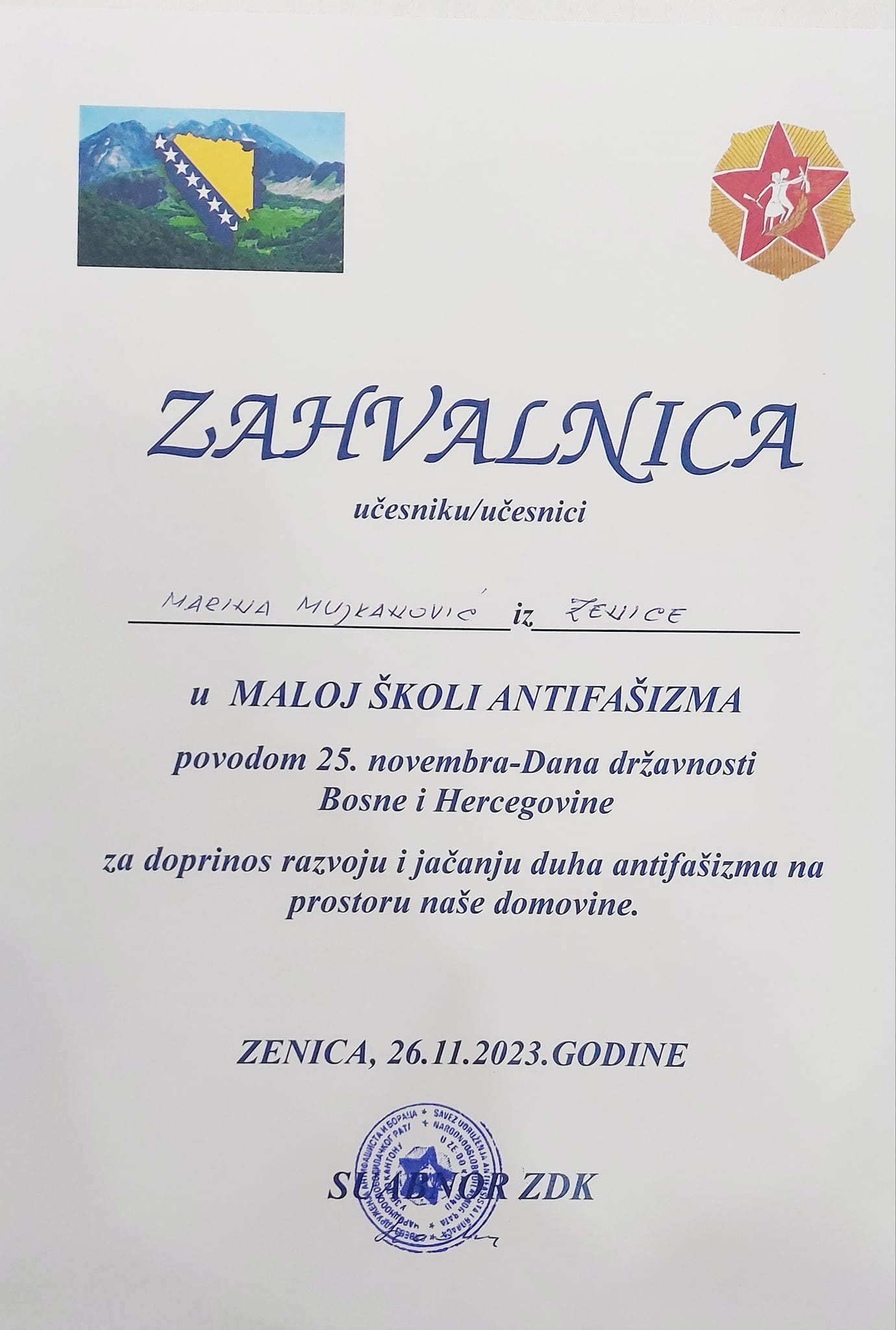 Danas, 26.11.2023.godine u Zenci, u organizaciji SUABNOR-a ZDK –a, povodom 80. godišnjice od Prvog zasjedanja ZAVNOBiH -a i Dana državnosti BiH, 25.novembra, održana je Mala škola antifašizma, saopštio nam je Sretko Radišić, predsjednik SUABNOR-a ZDK–a.