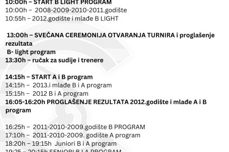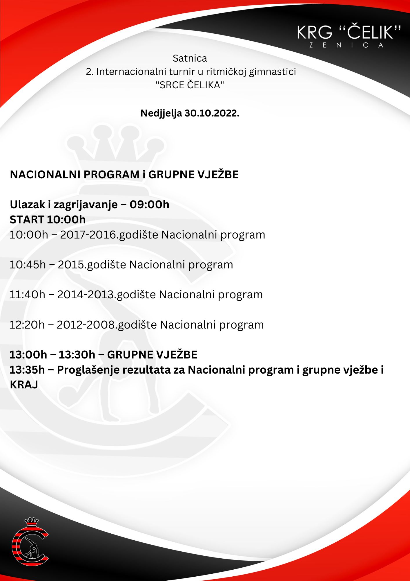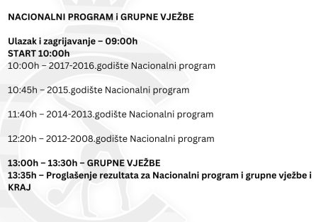 Takmičenje Nacionalnog programa i Grupnih vježbi će biti u nedjelju, sa početkom u 10:00h do 14:00h.