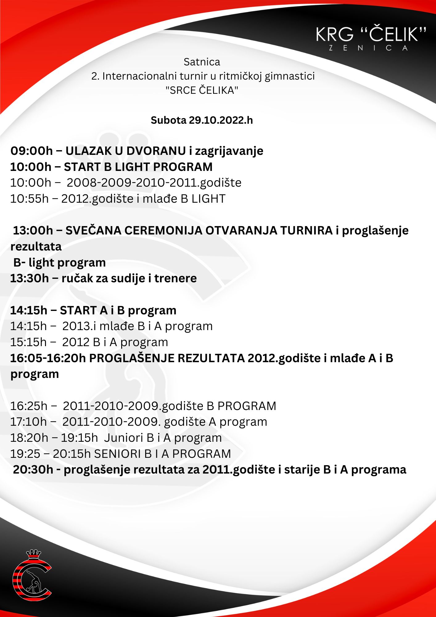 Danas, 29.10.2022.godine, u Zenici je svečano otvoren dvodnevni Drugi Internacionalni turnir u ritmičkoj gimnastici “SRCE ČELIKA” 2022. Takmičenje će se održati 29. i 30.oktobra 2022. godine (subota i nedjelja) u gradskoj Areni „Husejin Smajlović“ u Zenici.