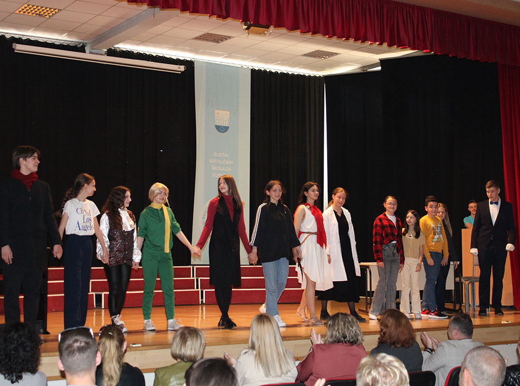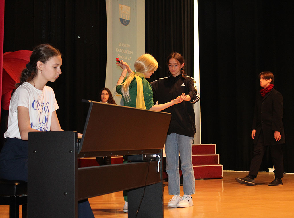 Nakon uvodnih pozdrava domaćina i podjele prigodnih darova, učenici KŠC-a izveli su prigodnu predstavu pod nazivom Brige, muke i pouke. Dramski komad koji je s učenicima pripremila s. Nada Abramović govori o izazovima kroz koje prolaze mladi tijekom školovanja te izbora fakulteta i zanimanja u budućnosti, s naglaskom na koje vrijednosti i osobe iz svijeta znanosti i umjetnosti se u tom traženju trebaju ugledati.