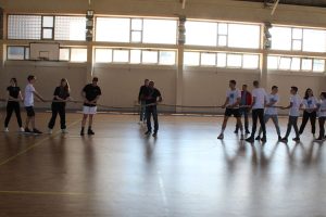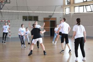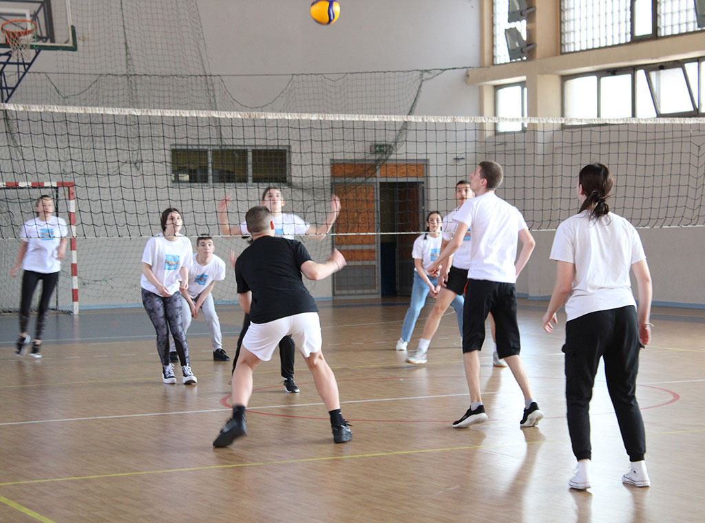 Uslijedio je sportski dio susreta, te se u dvorani odigrala odbojkaška utakmica mješovitih timova obiju škola. Posebno zanimljivo bilo je potezanje konopaca u kojem su se natjecali učenici, ali i profesori i profesorice. Učenici i profesori pokazali su ferplej igru i međusobnu prijateljsku podršku te da su, kako glasi i naziv projekta, zajedno u duhu – zajedno u sportu.