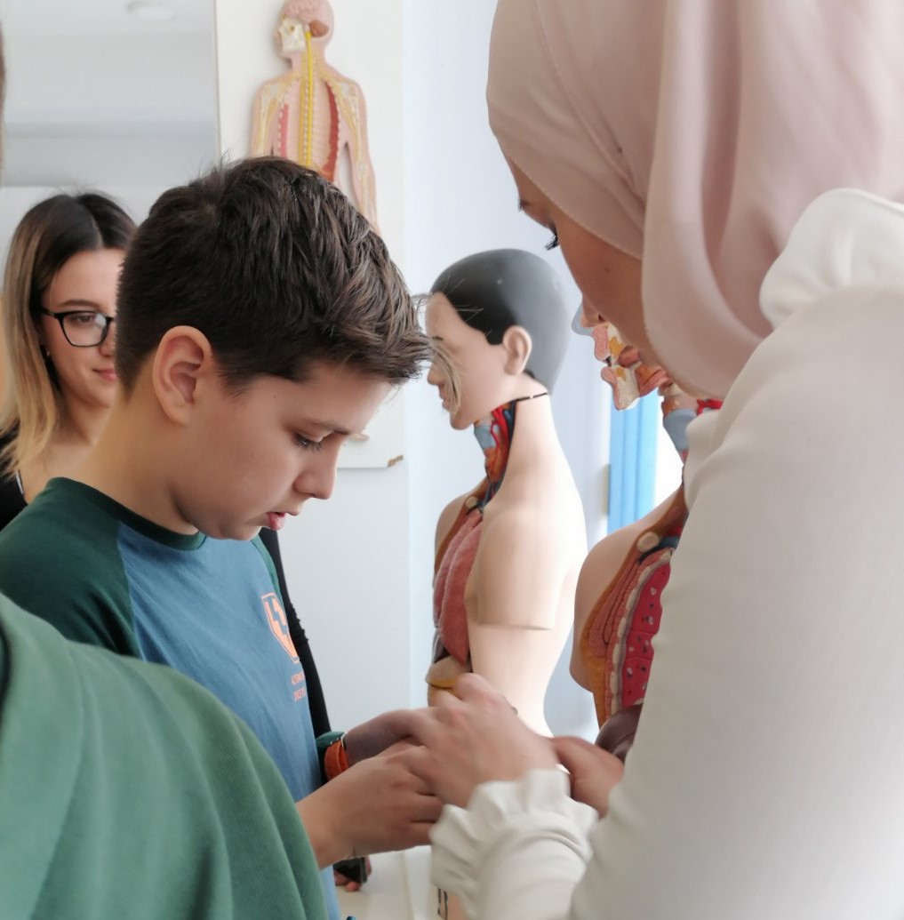 Asistenti i studenti Medicinskog fakultetu proveli su jedan školski sat sa učenicima na kojem su im pokazali nove elemente edukacije i možda orijentacije u budućem životu i profesiji. Domaćin posjete bio je doc dr sc Mirza Oruč.