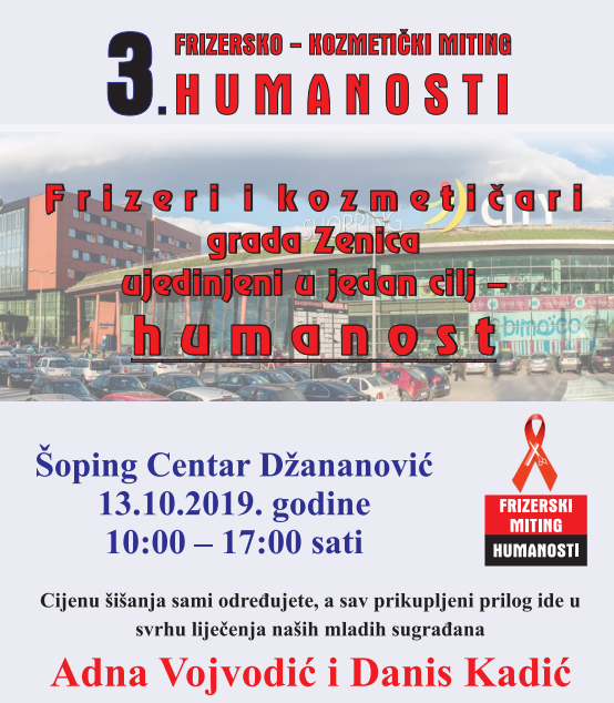 Frizersko-kozmetički miting humanosti: za liječenje Adne Vojvodić i Danisa Kadića – 13. oktobar – Sekcija frizera i kozmetičara Udruženja poslodavaca Zenica organizuje 3. frizersko-kozmetički miting humanosti u nedjelju, 13.10.2019. godine od 10:00 – 17:00 sati u Shoping centru Džananović, a za liječenje naših mladih sugrađana Adne Vojvodić i Danisa Kadića.