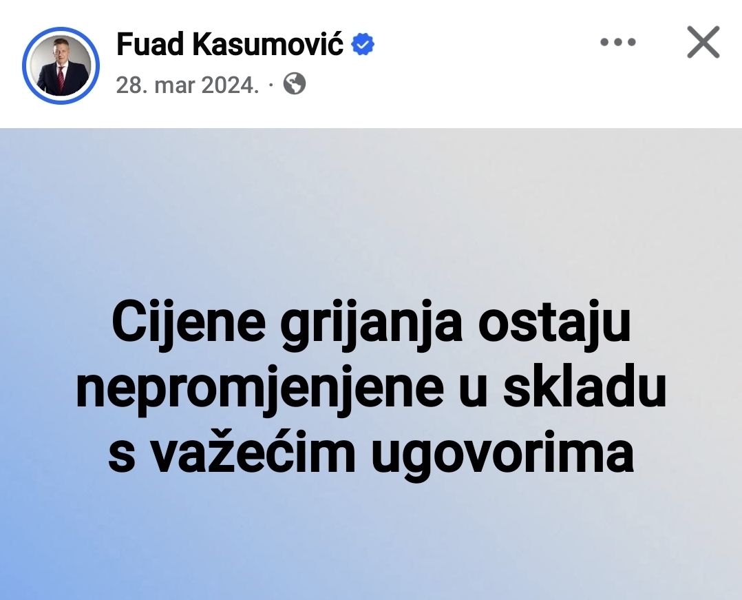 U konačnici, ostaje činjenica: poskupljenje grijanja predložilo je Javno preduzeće kojim upravlja upravo Kasumovićeva administracija. Umjesto da prizna stvarne razloge i probleme u funkcioniranju sistema grijanja, Kasumović cinično i bezočno obmanjuje građane, pokušavajući preusmjeriti pažnju na druge teme, jer, kako je i sam priznao, “zna sve”, osim očigledno kada mu to ne ide u prilog.