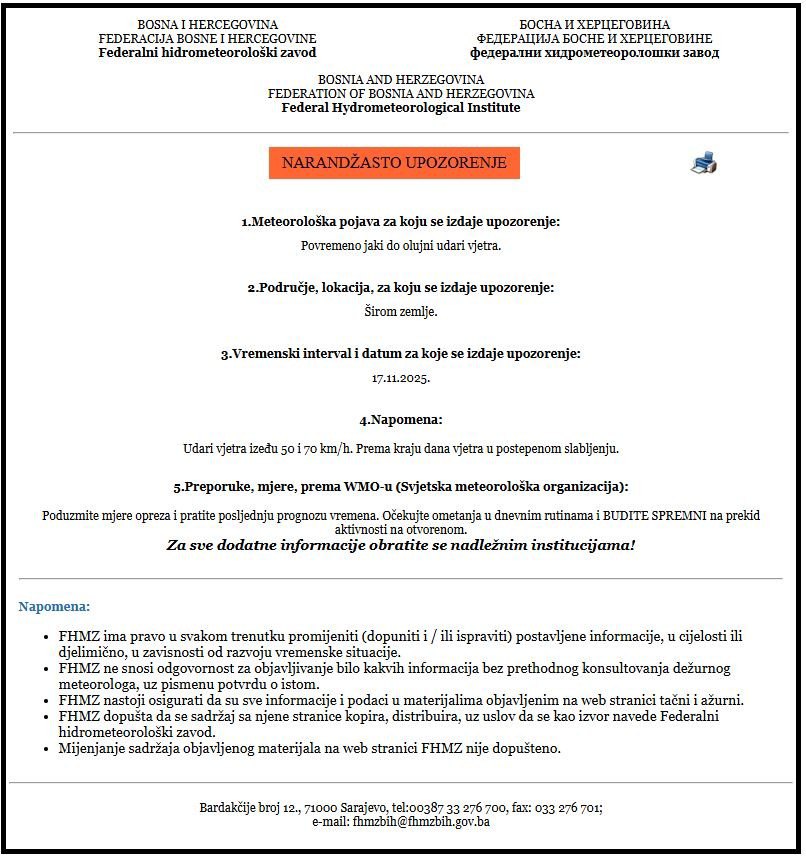 Podijelili su da je Federalni hidrometeorološki zavod za sutra upalio narandžasti meteoalarm, uz naznaku da se upozorenje izdaje za povremeno jake do olujne udare vjetra.