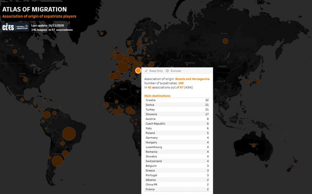 Fudbalski atlas: Koliko bh. fudbalera igra u inostranstvu, u kojim ih je zemljama najviše? – Međunarodni centar za sportske studije (CIES) objavio je najnovije brojke koje se odnose na broj fudbalera iz jedne zemlje koji nastupaju u inostranstvu.