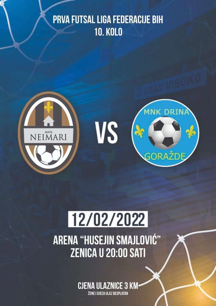 Predstojećeg vikenda, 12./13.2.2022.godine igraju se utakmice 10.kola Prve futsal lige FBiH, grupa 1, treće kolo drugog dijela sezone. Lider na tabeli, malonogometni klub (MNK) „Neimari“ Zenica ove subote 12.2. su domaćini ekipi MNK „Drina“ iz Goražda. U utakmici u Goraždu u jesenjem dijelu sezone u susretu ovih ekipa Neimari su slavili sa visokih 2:8.