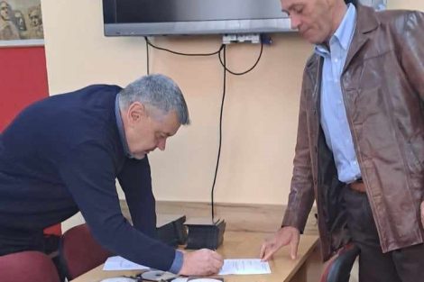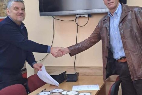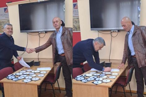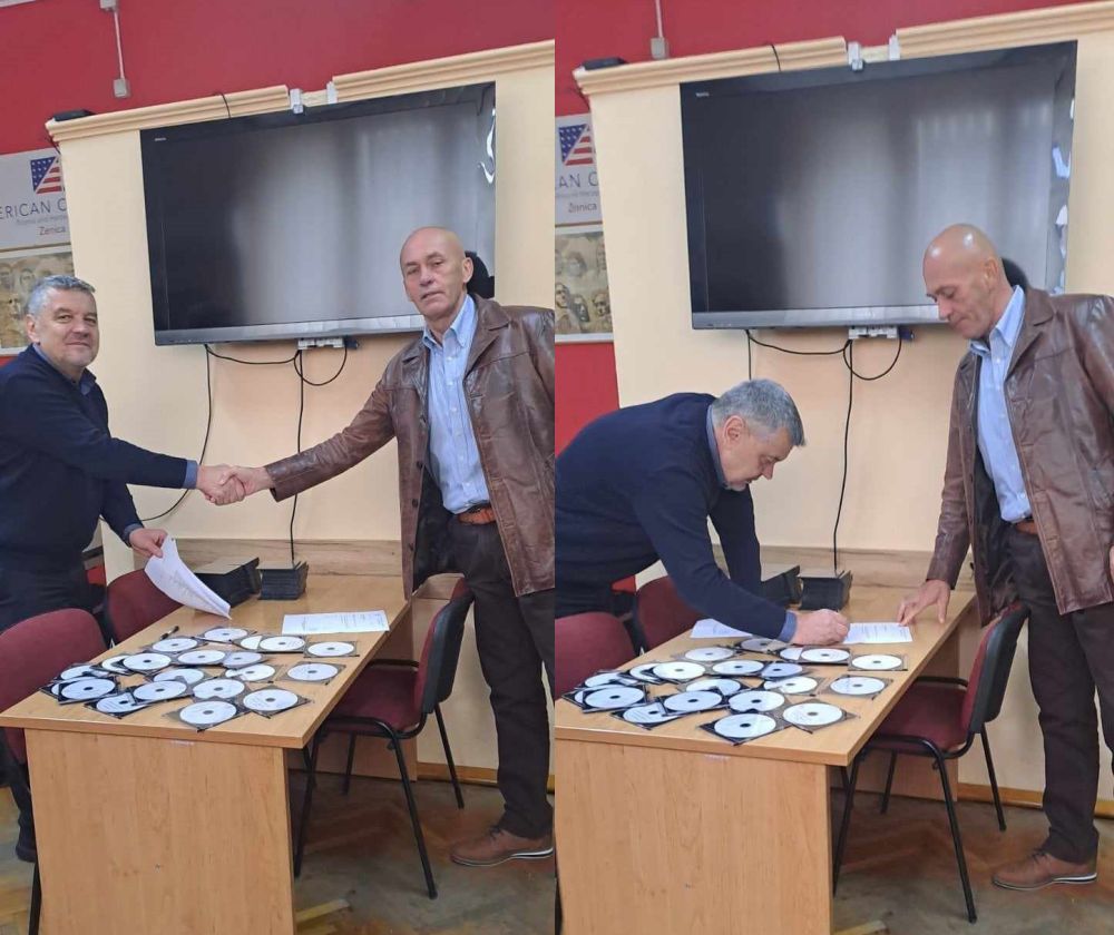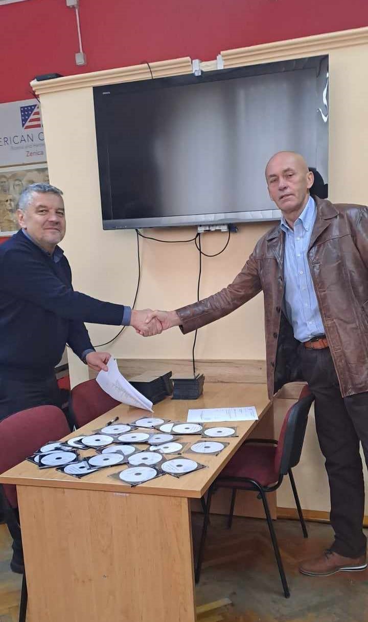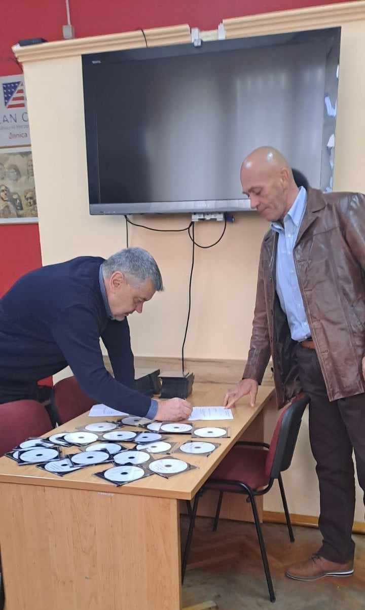 Sakib Pleh, direktor Biblioteke za slijepa i slabovidna lica knjige u zvučnom formatu, namijenjene za spomenutu kategoriju korisnika usluga uručio je Midhatu Kasapu, rukovodiocu Službe za matične poslove.