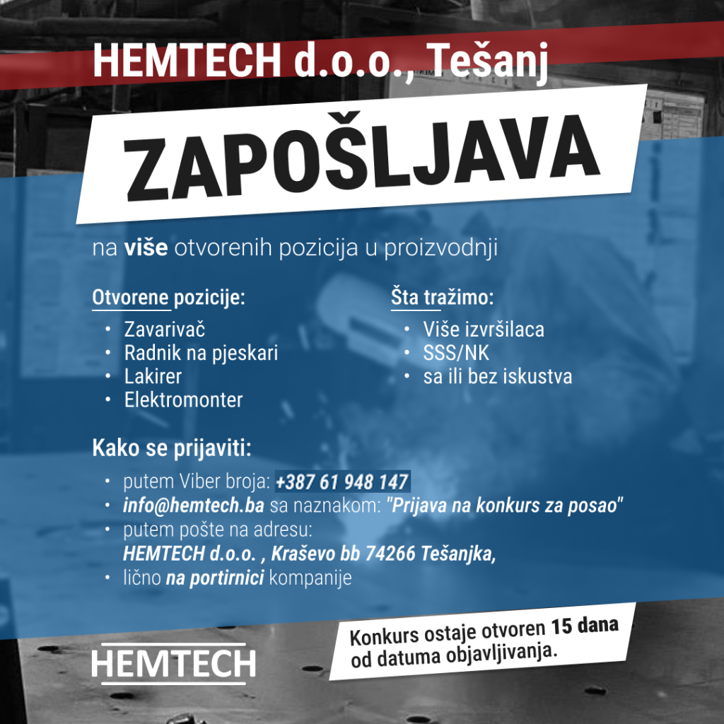• putem pošte na adresu: HEMTECH d.o.o. Tešanj, 74266 Tešanjka, Tešanj,