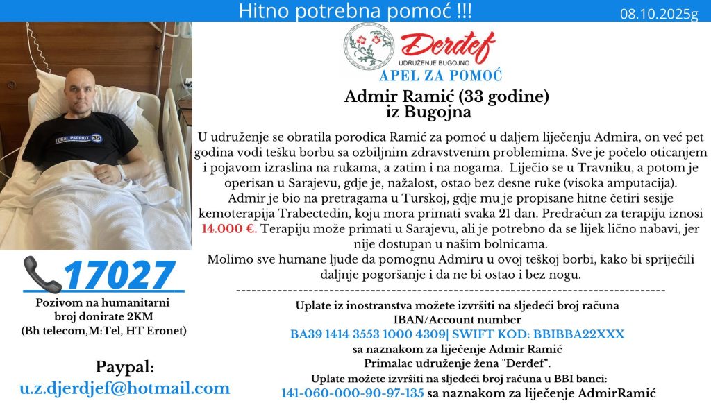 Udruženje žena “Đerđef” Bugojno ponovo pokreće humanitarnu akciju za Admira Ramića (33) iz Bugojna, koji i dalje vodi svoju najtežu bitku — borbu za život.