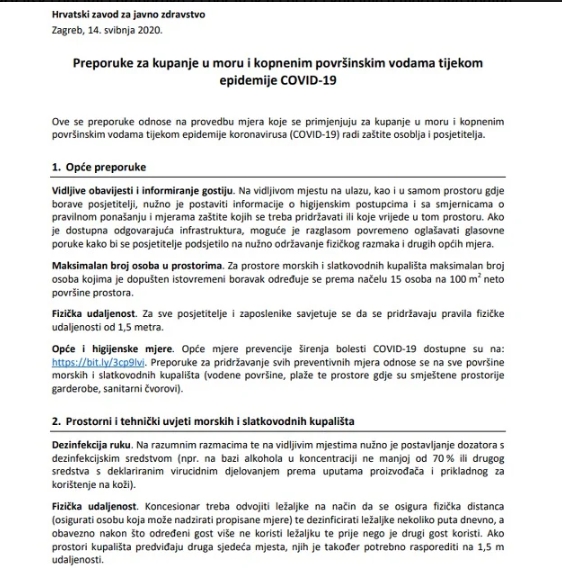 Hrvatska objavila preporuke za boravak na plaži i kupanje u moru ove godine – Hrvatski zavod za javno zdravstvo izdao je preporuke za kupanje u moru tokom epidemije koronavirusa, a radi zaštite osoblja i posjetitelja.
