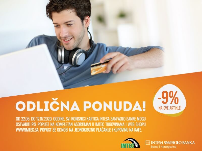 U periodu od 22. 6. – 12. 7. 2020. godine, na svim IMTEC prodajnim mjestima uključujući i webshop, plaćajte jednokratno i na rate karticama Intesa Sanpaolo banke i ostvarite 9% popusta. Popust se odnosi na cijeli prodajni asortiman.