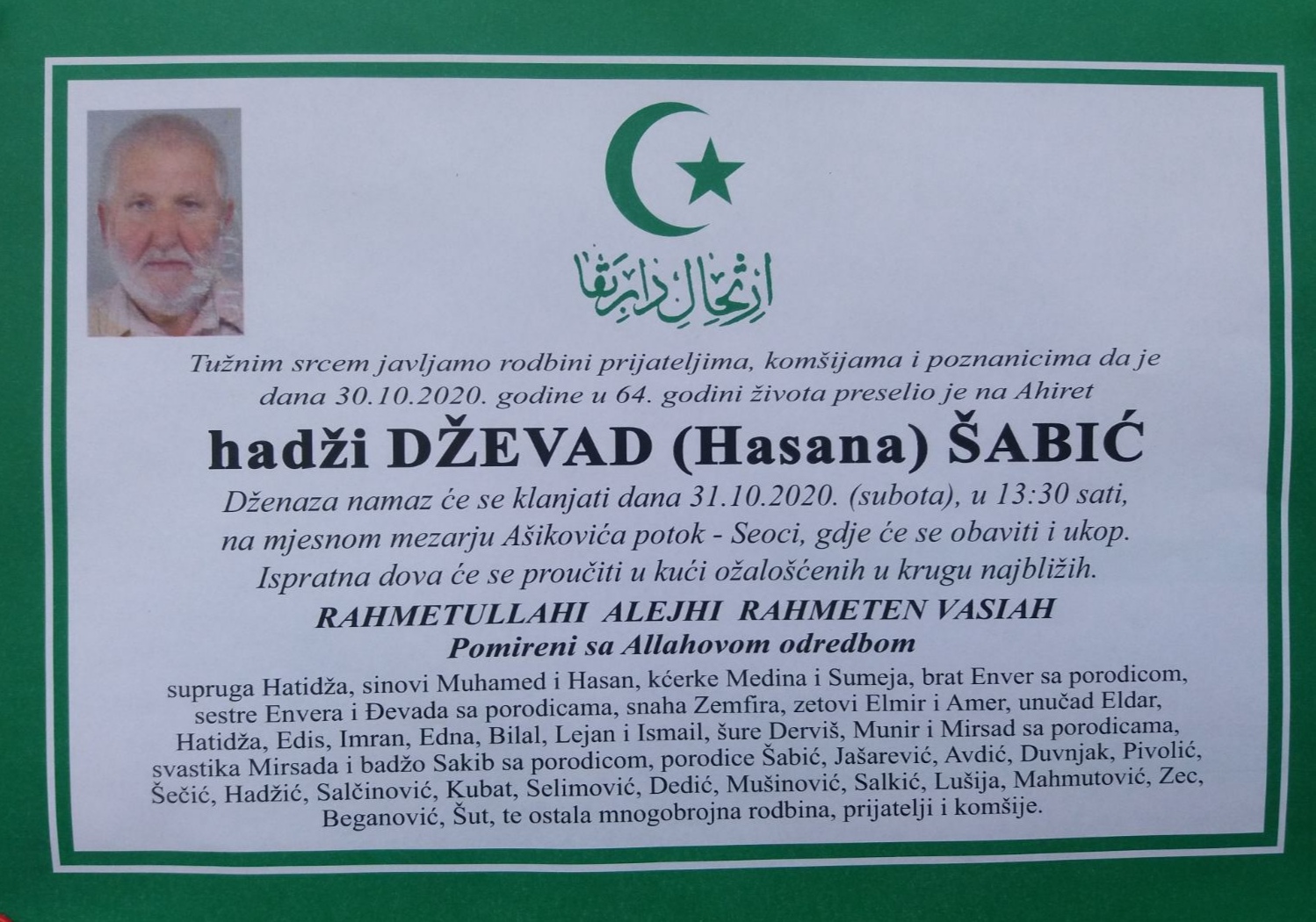 IN MEMORIAM: Dževad Šabić – U petak, 30.10.2020, u 64. godini života preselio je na ahiret naš dragi prijatelj, patriota, Zeničanin, hadžija Dževad Šabić.