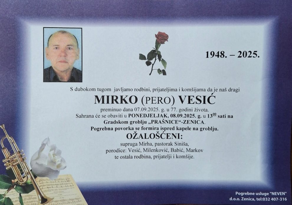 MIRKO (PERO) VESIĆ preminuo dana 07.09.2025. g. u 77. godini života.
