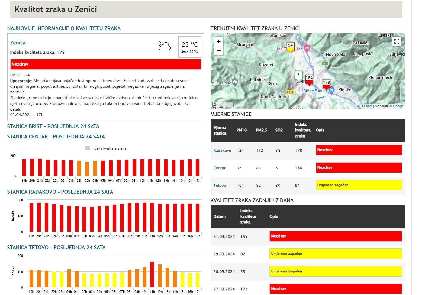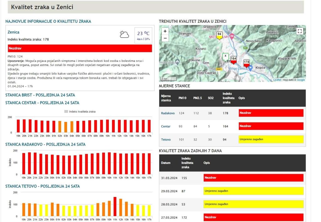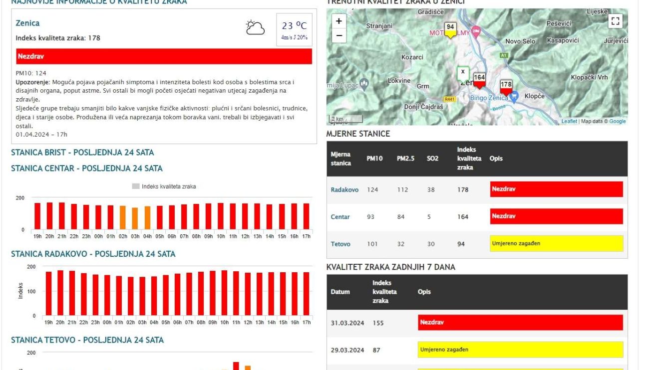 Indeks kvaliteta zraka u Zenici danas je 178 i na stranici Eko akcija okarakterisan je kao – nezdrav.
