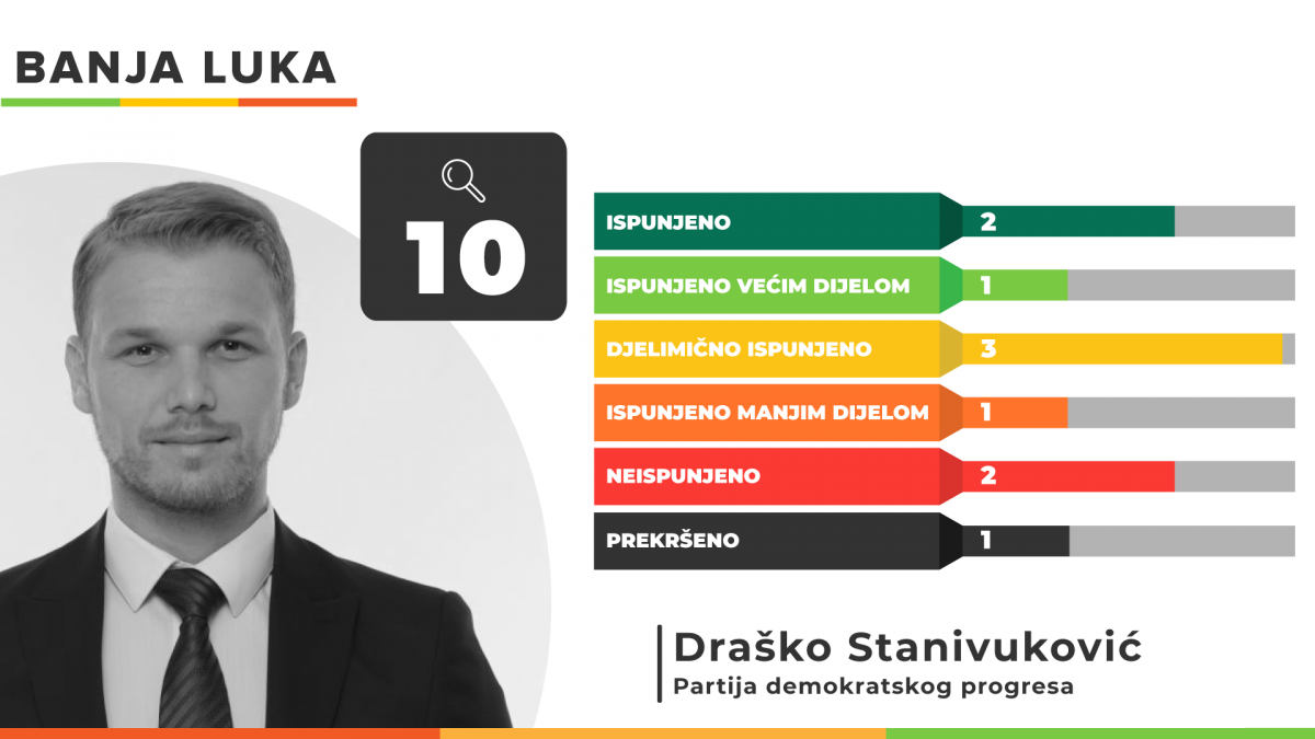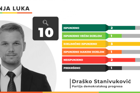 Od 10 obećanja koliko ih je u svom predizbornom programu dao gradonačelnik Banja Luke Draško Stanivuković u potpunosti su ispunjena dva, većim dijelom ispunjeno je jedno obećanje, djelimično tri, manjim dijelom još jedno. Dva obećanja ostala su potpuno neispunjena, dok je jedno prekršeno.