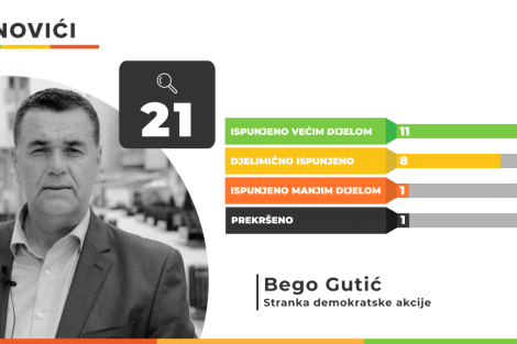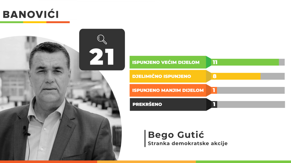 Načelnik Općine Banovići Bego Gutić dao je 21 predizborno obećanje 2020. godine, a od toga je većim dijelom ispunio 11 te isto toliko djelimično. Manjim dijelom ostalo je ispunjeno jedno obećanje, a jedno je prekršeno.
