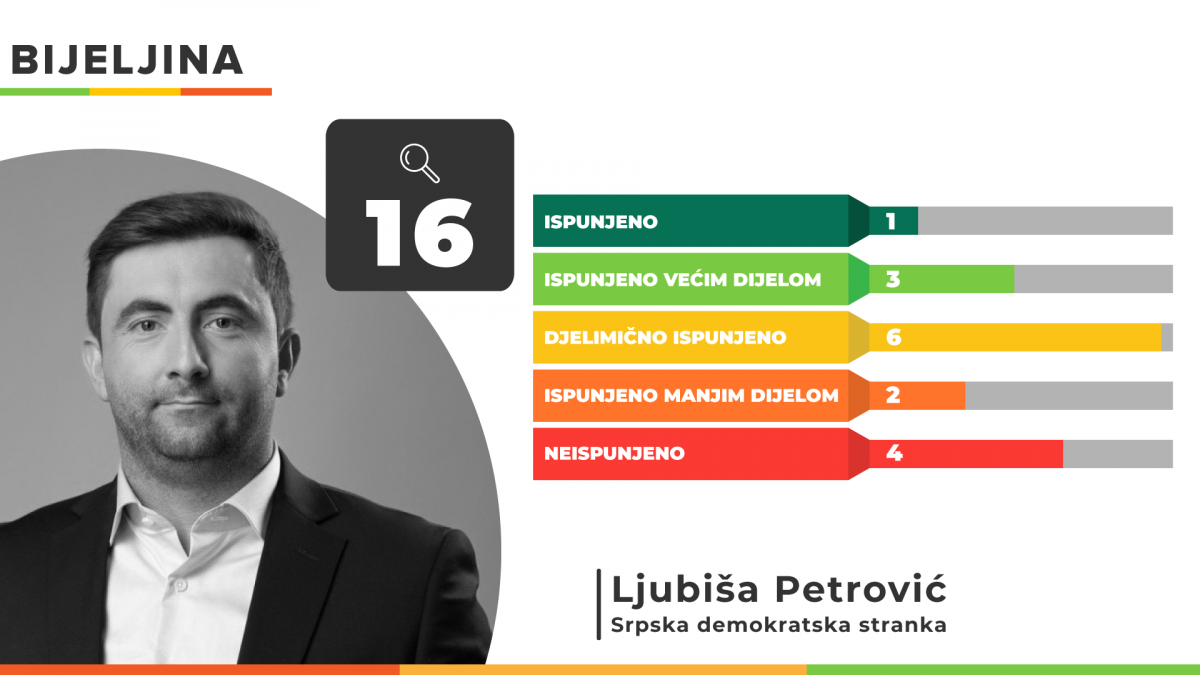 Na kraju monitoringa od 16 obećanja gradonačelnika Bijeljine Ljubiše Petrovića ispunjeno je jedno, većim dijelom tri, dok je 6 obećanja ocijenjeno kao djelimično ispunjeno. Manjim dijelom ispunjena su dva dok su 4 obećanja ocijenjena kao neispunjena. Ljubiša Petrović nije imao zvanični predizborni program u kampanji pred Lokalne izbore 2020. godine.