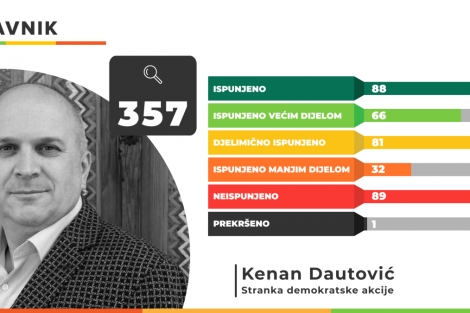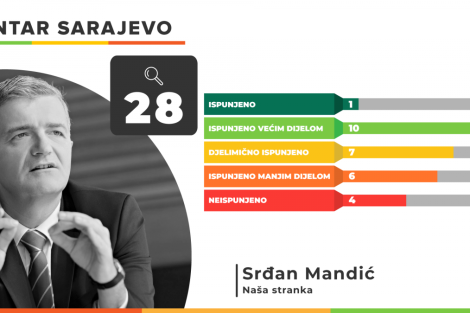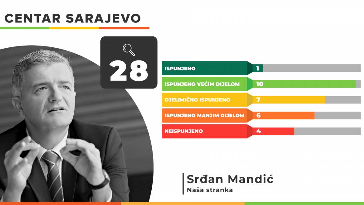 Istinomjer je pratio i 28 obećanja iz programa načelnika sarajevske Općine Centar Srđana Mandića, a od tog broja u potpunosti je ispunjeno jedno, a većim dijelom 10. Djelimično je ispunjeno 7, manjim dijelom 6, a 4 obećanja ostala su neispunjena.