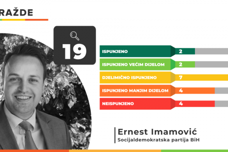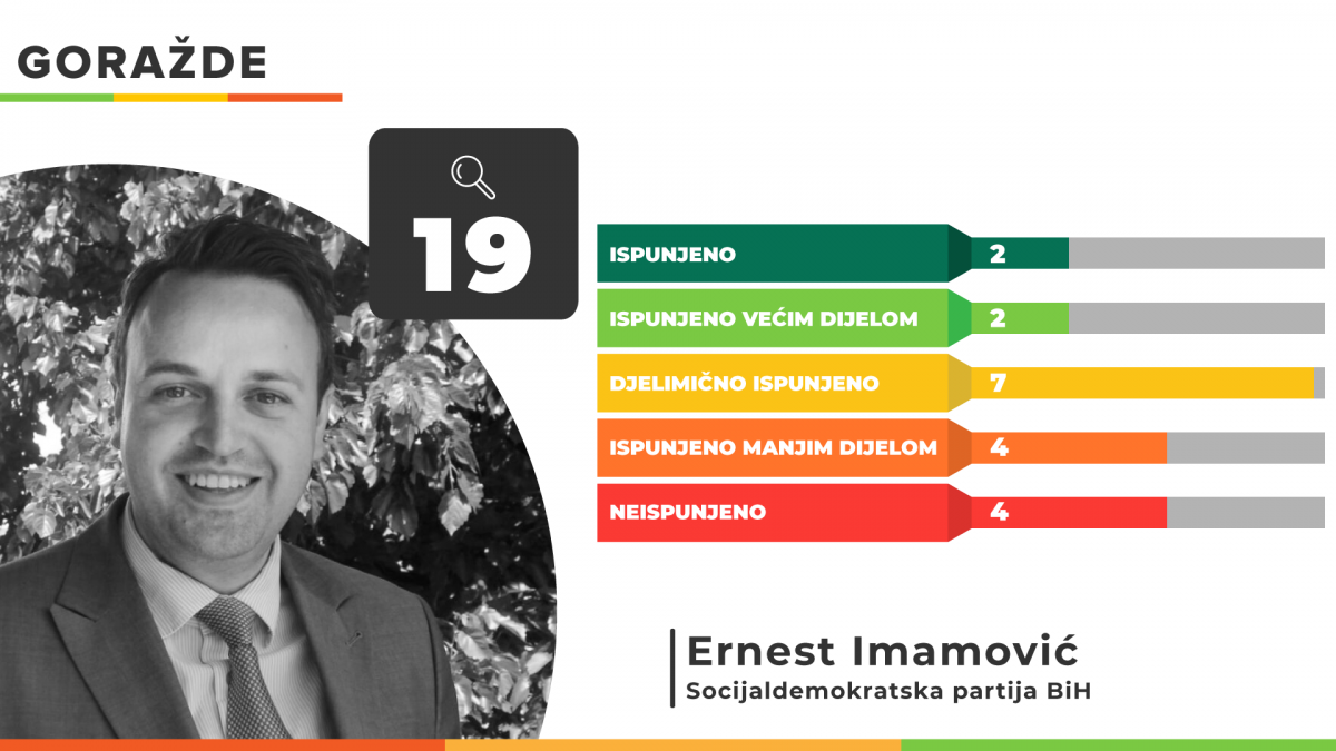 Gradonačelnik Goražda Ernest Imamović od 19 datih obećanja ispunio je 2 u potpunosti i isto toliko većim dijelom. Njegovih sedam obećanja ostalo je djelimično ispunjeno dok su po 4 ispunjena tek manjim dijelom ili neispunjena.
