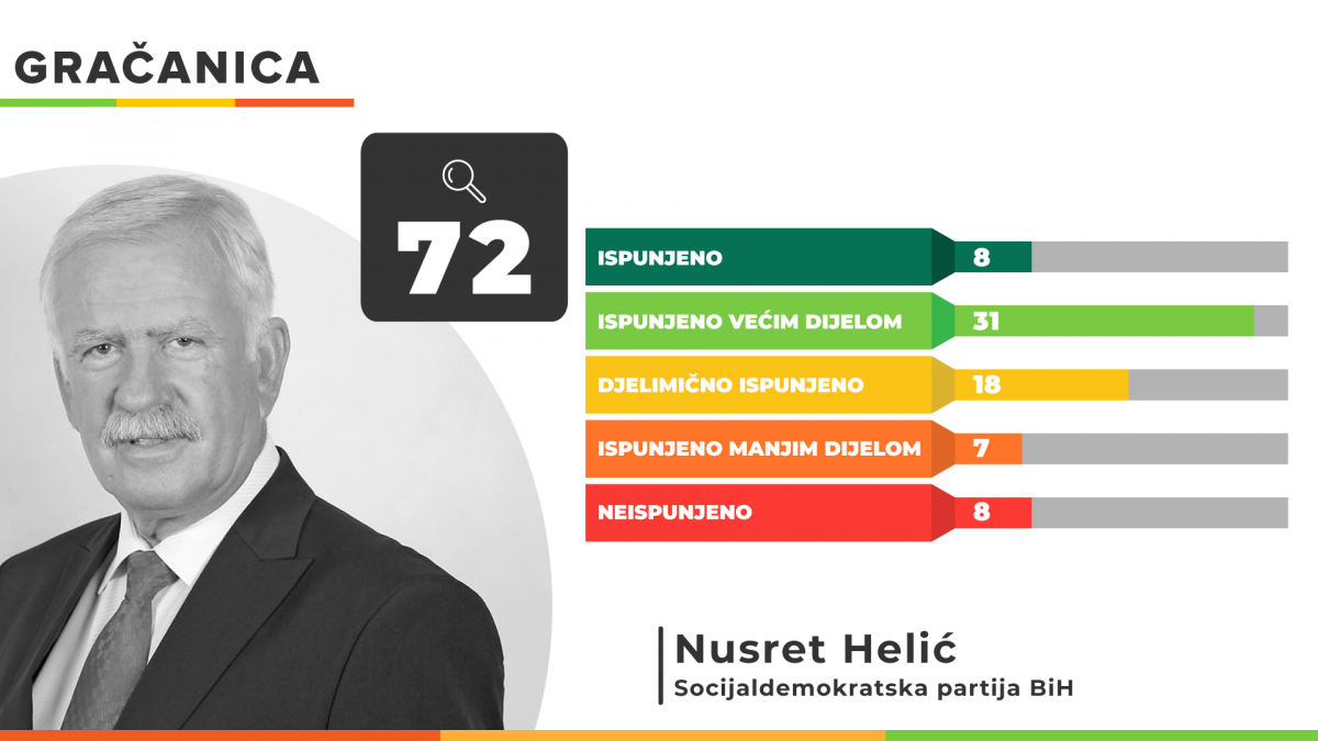 Načelnik Općine Gračanica ispunio je u potpunosti 8 od ukupno 72 koliko ih je imao u predizbornom programu iz 2020. godine, a većim dijelom ispunjeno ih je 31. Djelimično je ispunjeno 18 obećanja, dok je 7 obećanja ostalo ispunjeno manjim dijelom, a 8 neispunjeno.