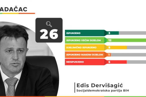 Od 26 obećanja načelnika Gradačca Edisa Dervišagića 3 su ispunjena u potpunosti, a 12 većim dijelom. Pet obećanja ispunjeno je djelimično, a jedno manjim dijelom. Neispunjeno je ostalo 5 Dervišagićevih obećanja.