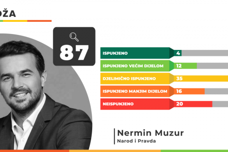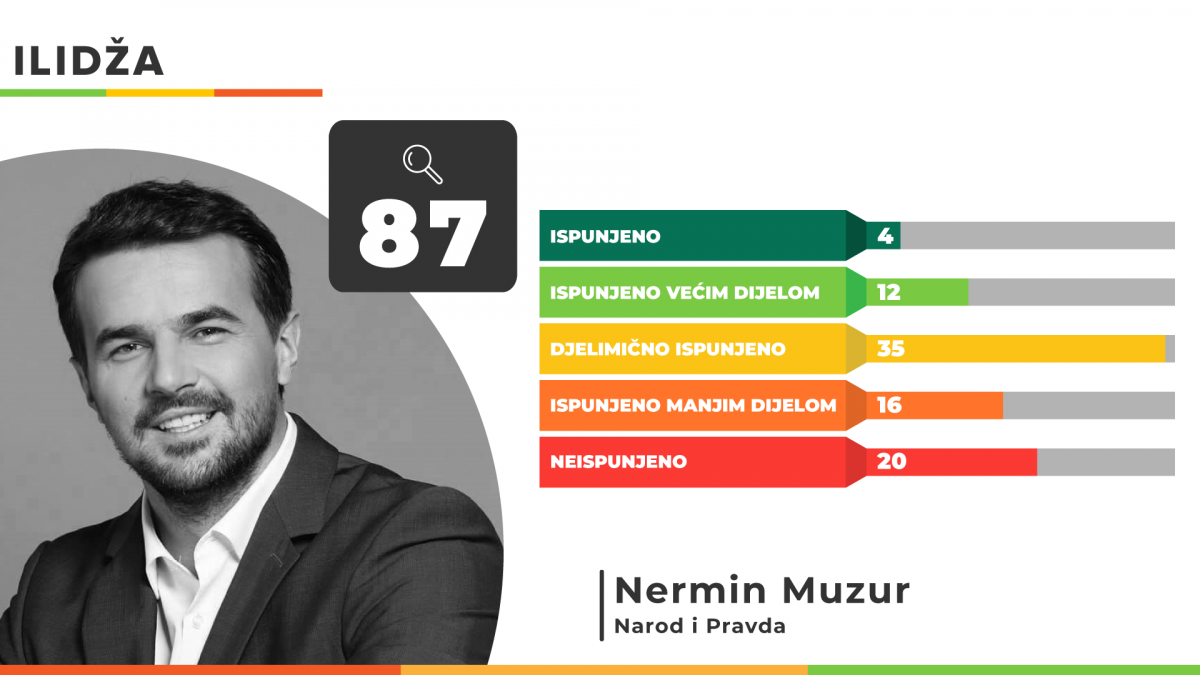 U Općini Ilidža načelnik Nermin Muzur potpuno je ispunio 4, a većim dijelom 12 obećanja iz svog predizbornog programa 2020. godine u kojem je ukupno dao 87 obećanja. Djelimično ih je ispunjeno 35, 16 manjim dijelom, dok je 20 obećanja Nermina Muzura ostalo neispunjeno.