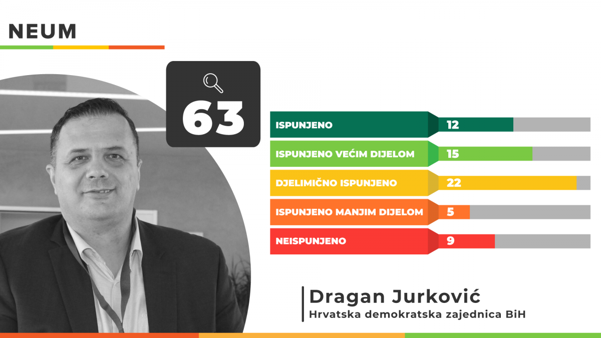 U Općini Neum Dragan Jurković ispunio je u potpunosti 12 obećanja te još njih 15 većim dijelom. Od ukupno 63 obećanja koliko ih je imao u svom predizbornom programu djelimično su ispunjena 22, pet ih je ispunjeno manjim dijelom dok ih je 9 ostalo neispunjeno.