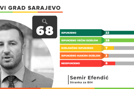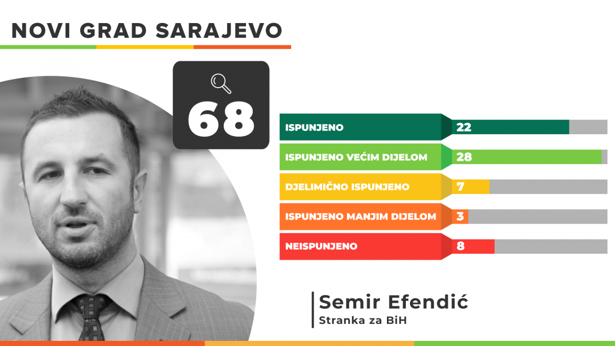 Načelnik Općine Novi Grad Sarajevo Semir Efendić od 68 obećanja iz svog programa ispunio ih je 22 u potpunosti te još 28 većim dijelom. Sedam njegovih obećanja ostalo je djelimično ispunjeno, 3 su ispunjena manjim dijelom, a 8 ih je ostalo neispunjeno.