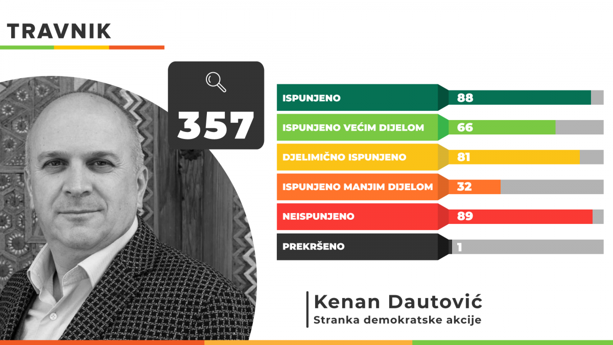Najveći broj obećanja Istinomjer je pratio iz programa Kenana Dautovića, načelnika Općine Travnik koji je mandat preuzeo u maju 2021. godine, nakon ponovljenih izbora u toj općini. Od 357 obećanja iz programa ispunjeno ih je 88, dok je 66 obećanja ispunjeno većim dijelom. Djelimično je ispunjeno još 81 obećanje, a manjim dijelom 31. Ukupno 89 obećanja Kenana Dautovića ostalo je neispunjeno dok je jedno prekršeno tokom mandata.