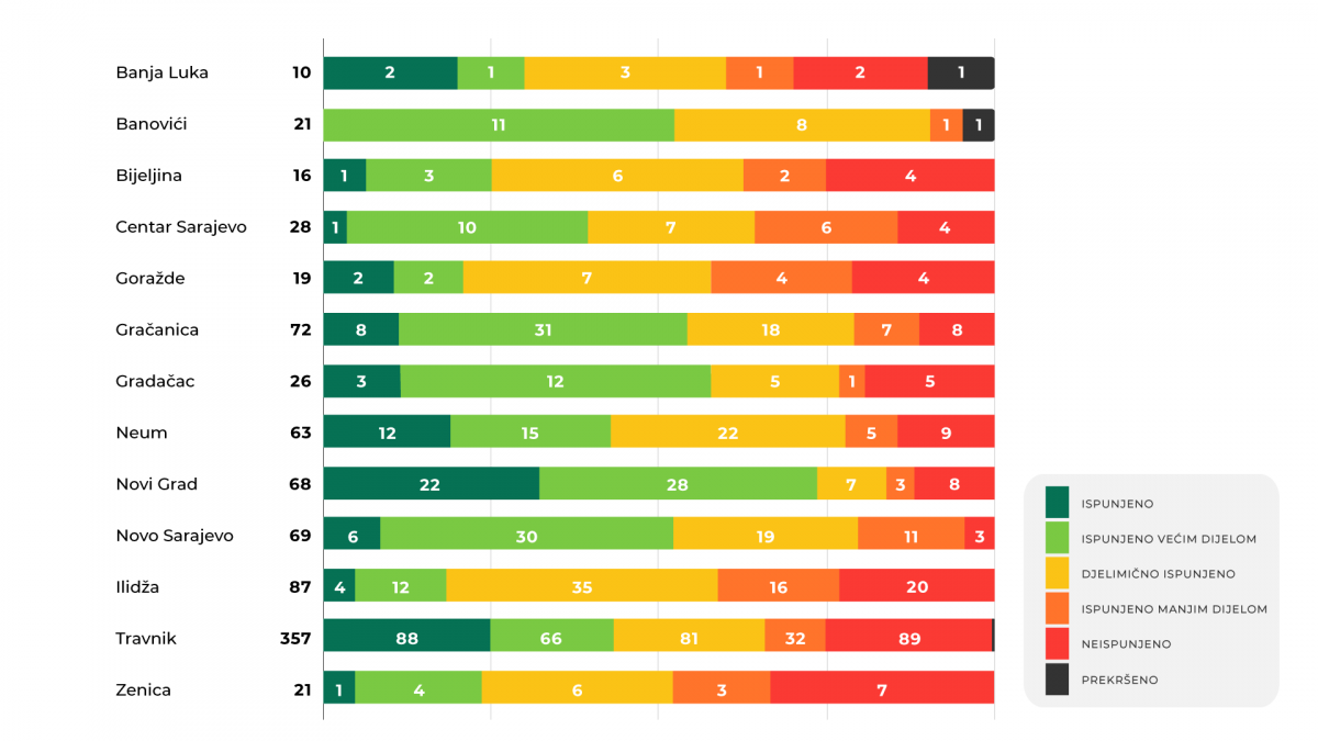 Na lokalnom nivou procenat ispunjenosti doseže blizu 50% dok ispunjenje obećanja viših nivoa vlasti prema monitoringu rijetko doseže dvocifren procenat. Procenat neispunjenih obećanja na lokalnom nivou u 13 općina i gradova zajedno kreće se oko 30%.