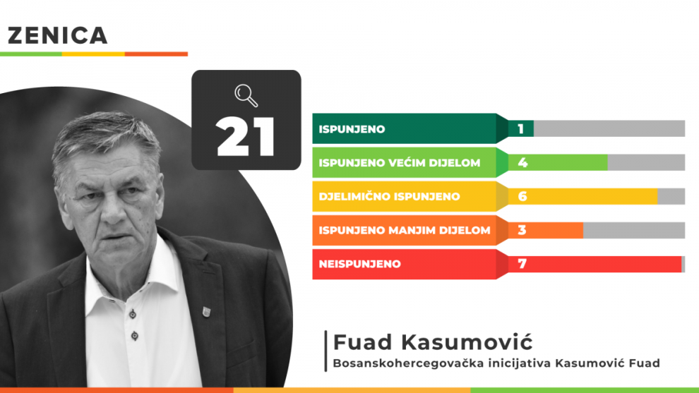 Ukupno 21 predizborno obećanje Istinomjer je prikupio u slučaju gradonačelnika Zenice Fuada Kasumovića koji nije imao zvanični predizborni program. Od tog broja ispunjeno je jedno dok su većim dijelom ispunjena 4 obećanja. Šest obećanja Fuada Kasumovića ispunjeno je djelimično, a 3 manjim dijelom. U potpunosti je neispunjeno 7 obećanja gradonačelnika Zenice.