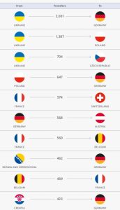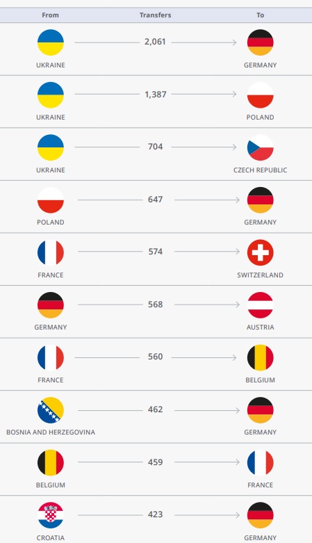 Među top 10 su transferi iz Poljske u Njemačku, iz Francuske u Švicarsku i Belgiju, iz Belgije u Francusku, iz Njemačke u Austriju…