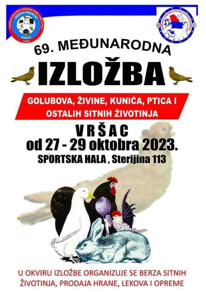 U organizaciji udruženje odgajivača golubova, živine, kunića i ptica „Vršački prevrtač“ i Asocijacija udruženja odgajivača sitnih životinja, od 27. do 29. oktobra, u sportskoj hali Hemijsko – medicinske škole, organizovana 69. Međunarodna izložba golubova, živine, kunića, ptica i ostalih sitnih životinja.