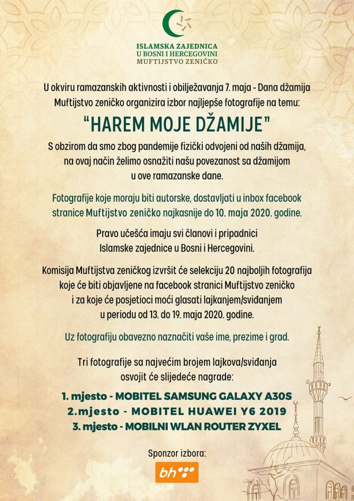 Fotografije koje moraju biti autorske, dostavljati u inbox facebook stranice Muftijstvo zeničko najkasnije do 10. maja 2020. godine.