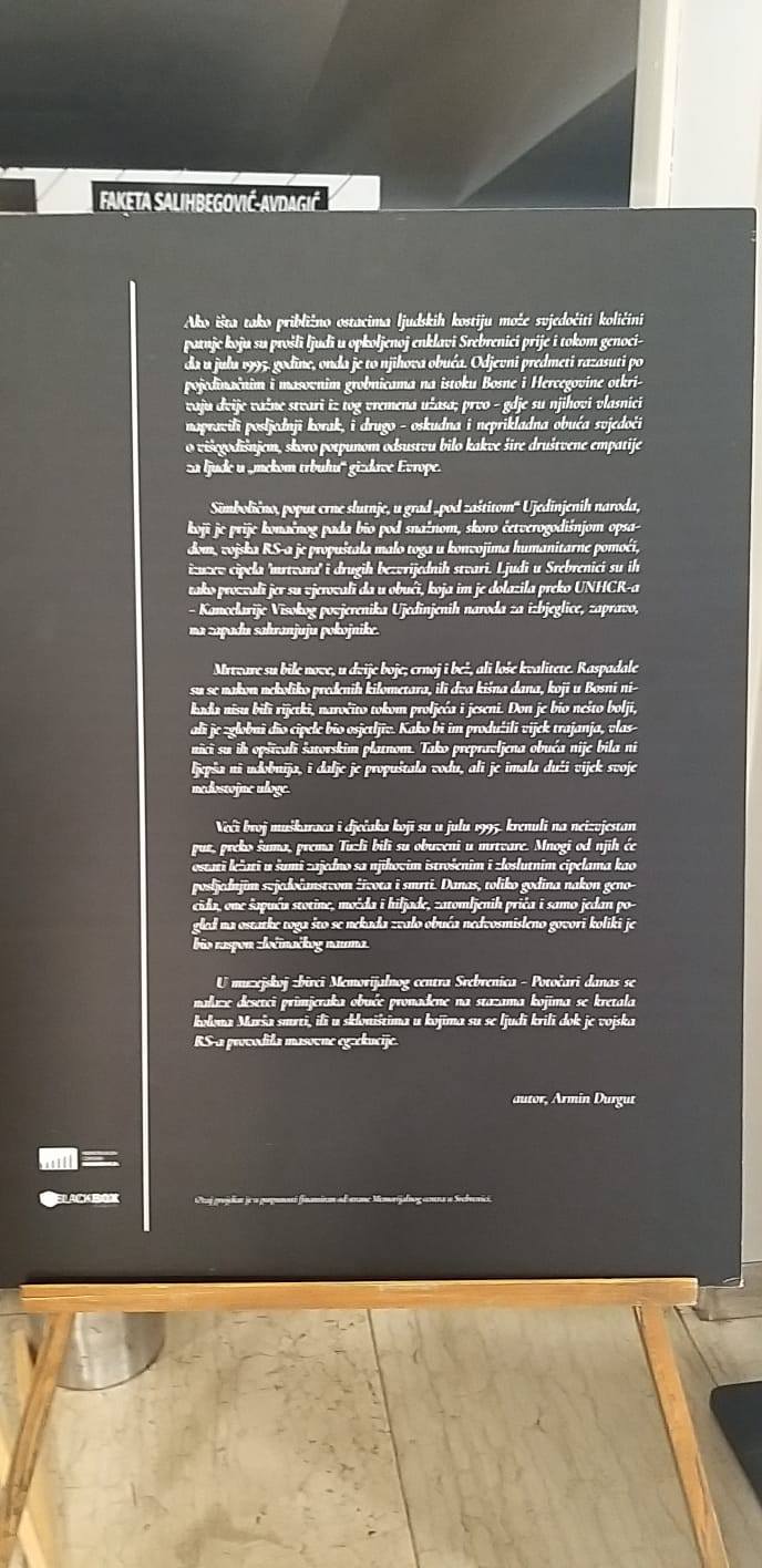 Ova mobilna izložba, kako je istakla predsjednica Galerije “Preporod” Amna Sofić, predstavlja snažno vizuelno svjedočanstvo genocida u Srebrenici te se fokusira na obuću žrtava pronađenih duž trase Marša smrti. Autor izložbe je poznati zenički fotoreporter Armin Durgut.