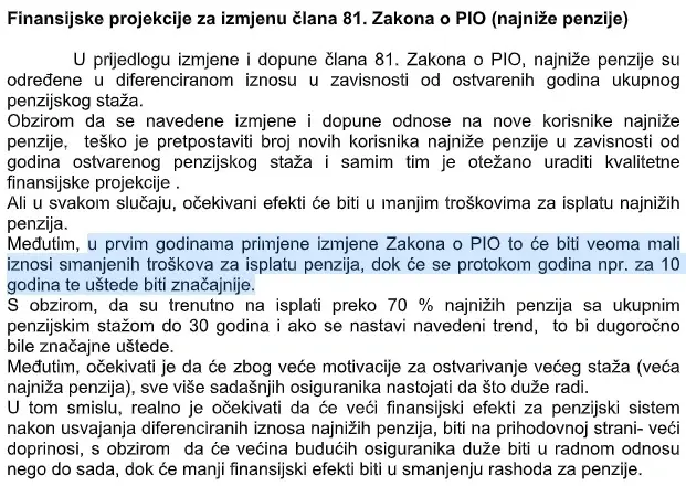 U finansijskoj projekciji Federalnog ministarstva rada i socijalne politike stoji kako će u prvim godina primjene izmjena Zakona o PIO-u u članu 81. biti veoma mali iznosi smanjenih troškova za isplatu penzija, dok će “protokom godina, npr. za 10 godina te uštede biti značajnije”.