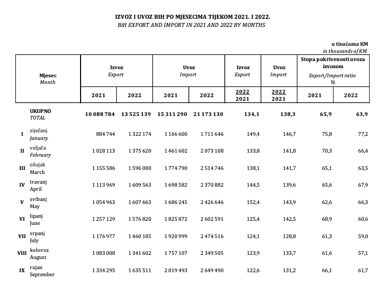 U razdoblju januar-septembar 2022. godine izvoz iz Bosne i Hercegovine je iznosio 13 milijardi 525 miliona KM, što je za 34,1 % više nego u istom razdoblju 2021. godine, dok je uvoz iznosio 21 milijardu 173 miliona KM, što je za 38,3 % više nego u istom razdoblju prethodne godine, pokazuju najnoviiji podacim o robnoj razmjeni Agencije za statistiku BiH.
