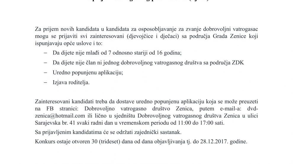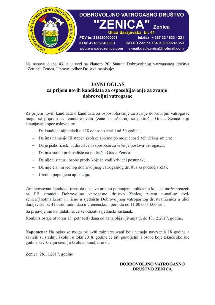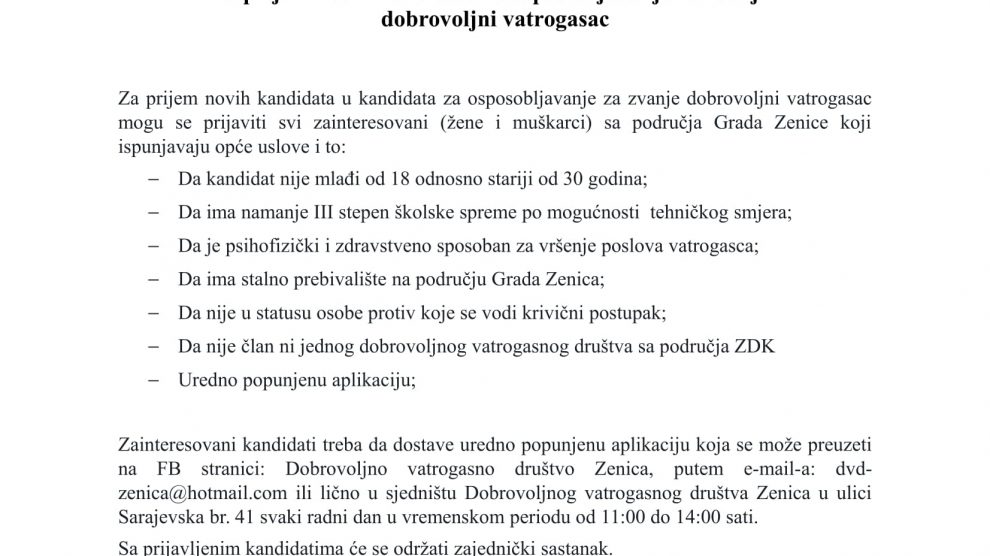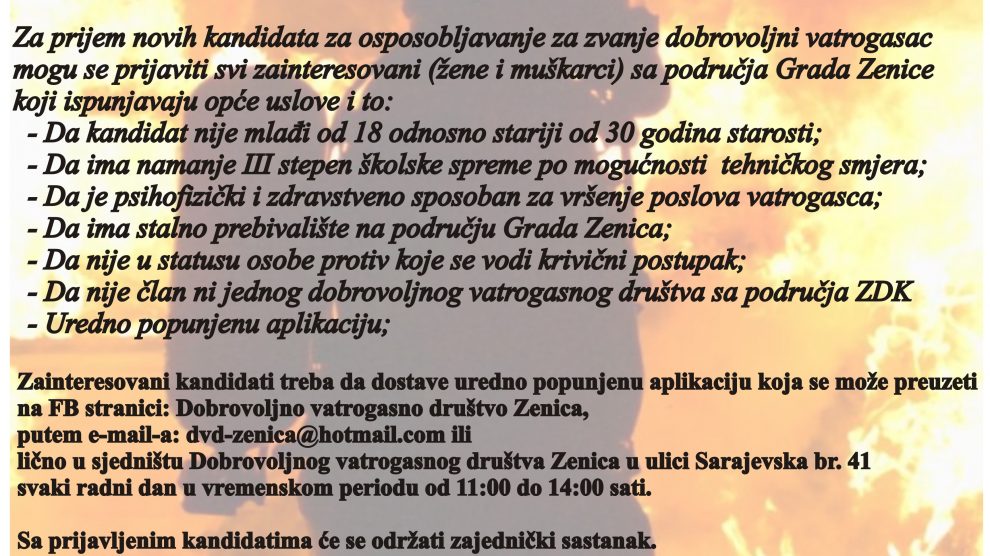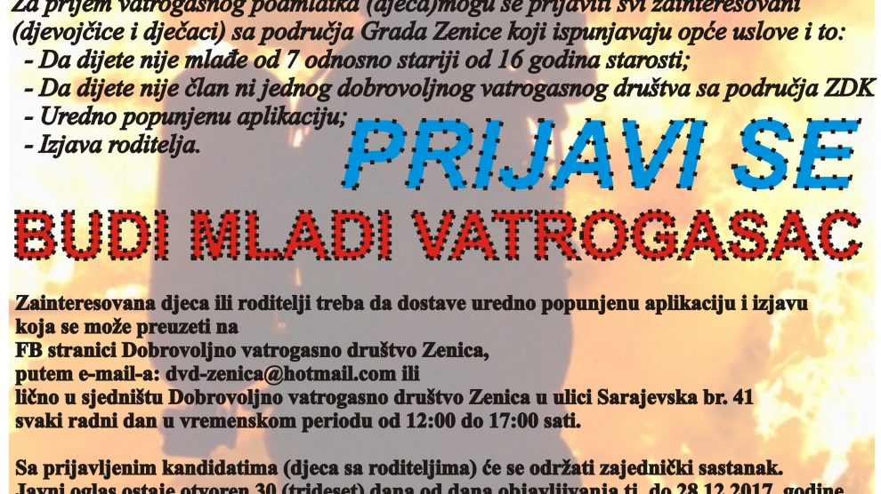 Javni oglas za prijem vatrogasnog podmlatka i novog osoblja za ospobljavanje za zvanje dobrovoljni vatrogasac – Javni oglas za prijem vatrogasnog podmlatka i novog osoblja za ospobljavanje za zvanje dobrovoljni vatrogasac. Aplikacije možete popuniti na sljedećim linkovima:
