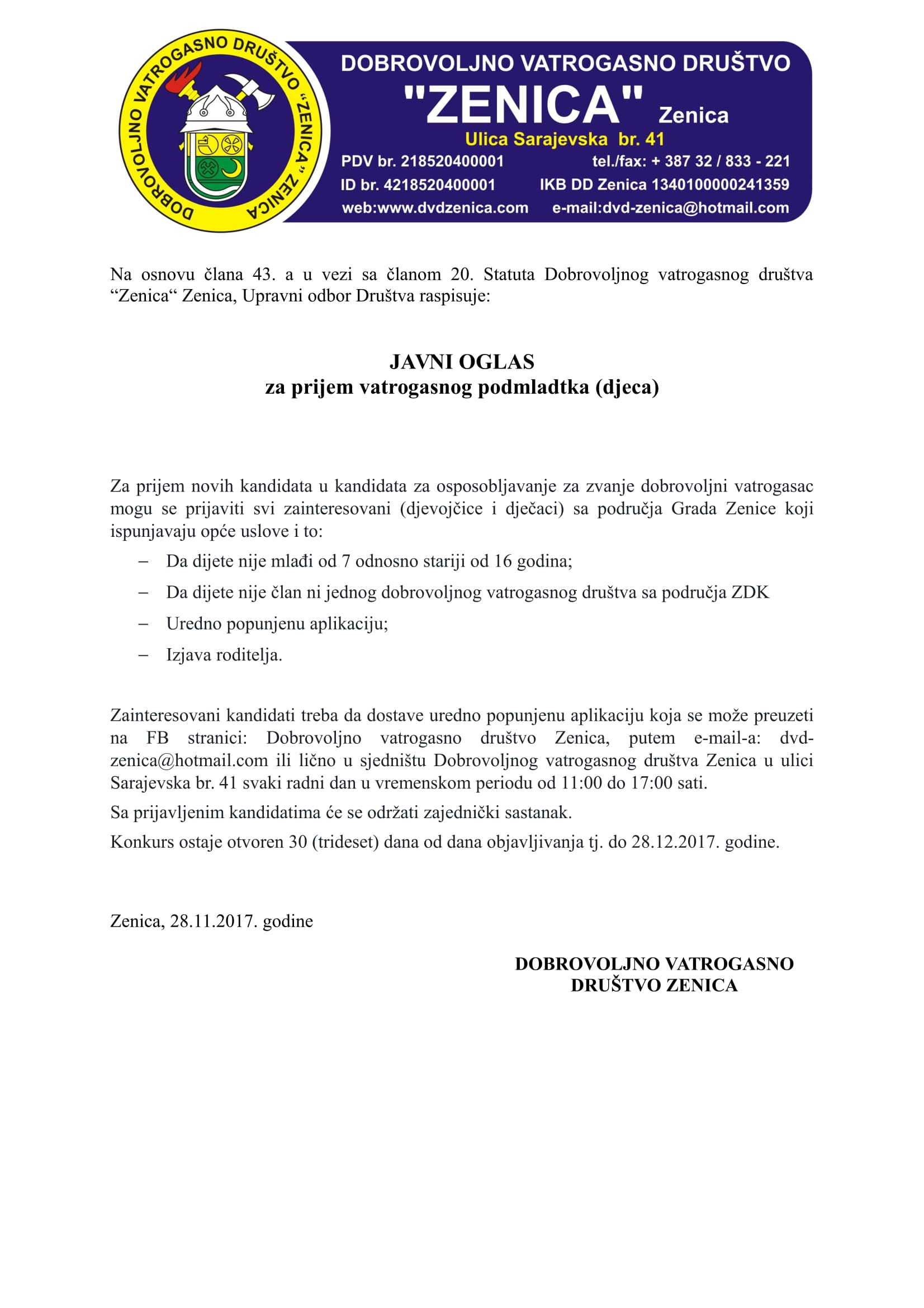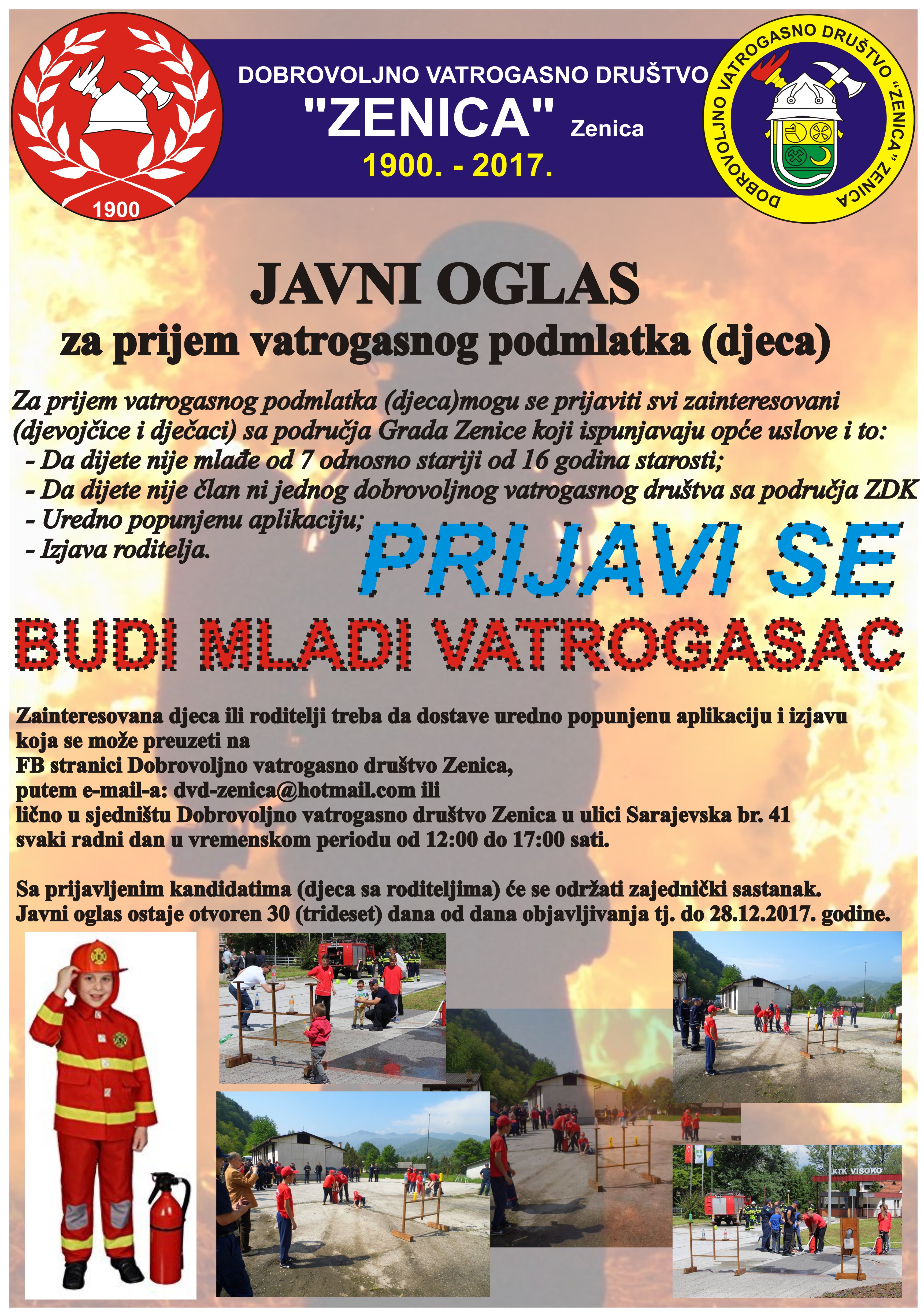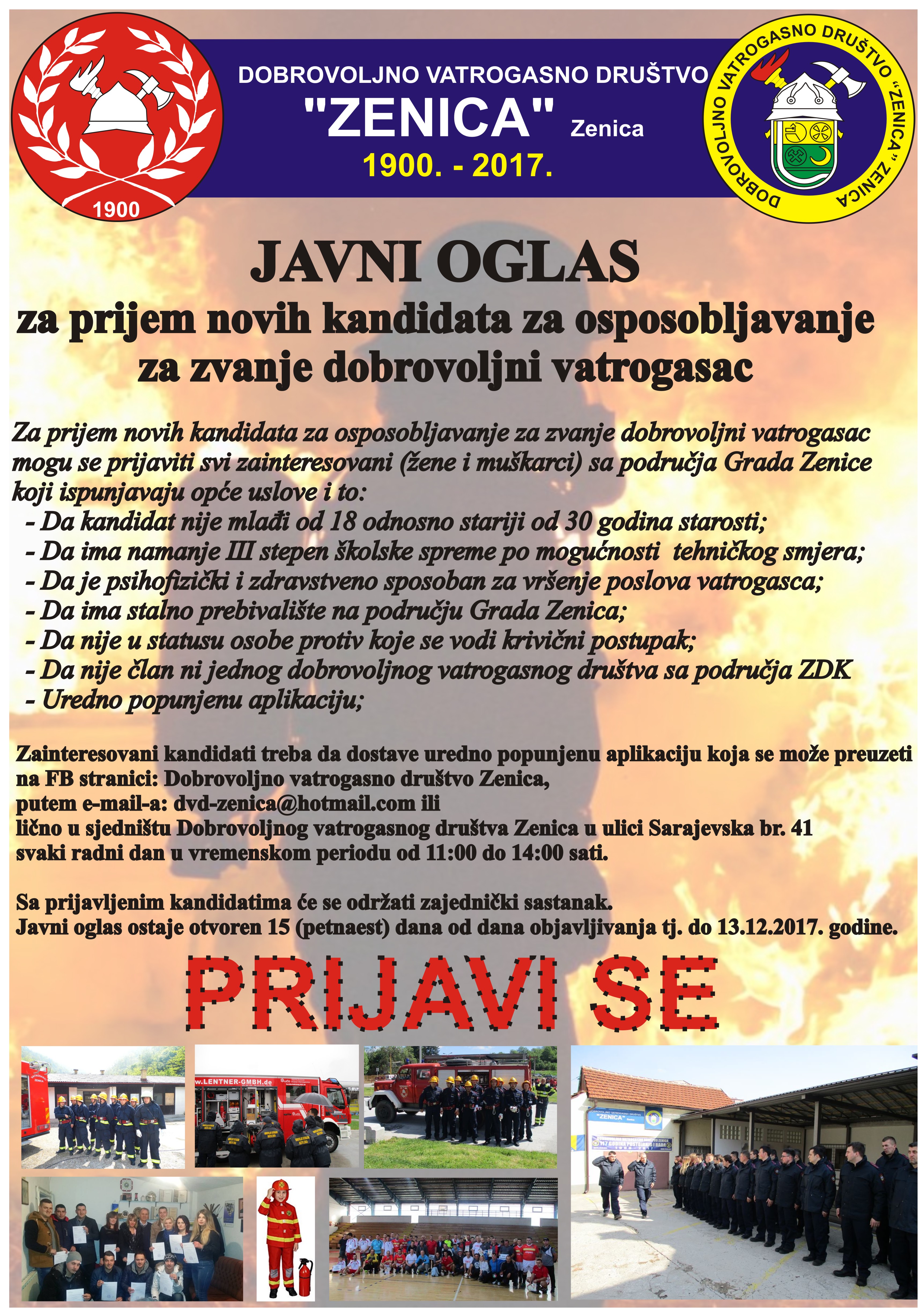 Javni oglas za prijem vatrogasnog podmlatka i novog osoblja za ospobljavanje za zvanje dobrovoljni vatrogasac – Javni oglas za prijem vatrogasnog podmlatka i novog osoblja za ospobljavanje za zvanje dobrovoljni vatrogasac. Aplikacije možete popuniti na sljedećim linkovima: