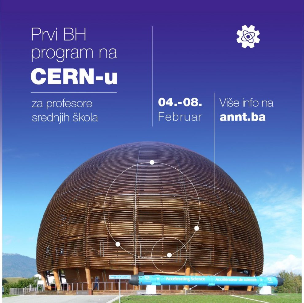 Evropska organizacija za nuklearna istraživanja (CERN) i Asocijacija za napredak nauke i tehnologije (ANNT) Vas pozivaju na prvi bosanskohercegovački program za profesore koji će se održati od 4. do 8. februara 2020. godine na CERN-u. Program uključuje naučna predavanja na našem jeziku, posjete eksperimentima na CERN-u, izložbe, te praktične radionice koji imaju za cilj upoznati učesnike s trenutnim istraživanjima u fizici čestica. Detaljan program možete pogledati na https://indico.cern.ch/event/840248/timetable/.