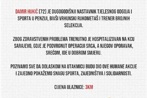 Prikupljena sredstva bit će donirana Damiru Hukiću, dugogodišnjem nastavniku tjelesnog i zdravstvenog odgoja, bivšem vrhunskom rukometašu i treneru, koji se trenutno oporavlja nakon operacije srca obavljene na Kliničkom univerzitetskom centru u Sarajevu.